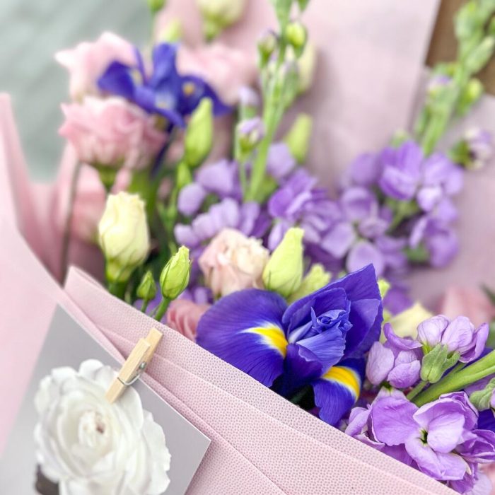 Лизиантус – 4 шт.Маттиола лавандовая – 3 шт.Открыточка с вашими пожеланиями – 1 шт.Средство для продления жизни цветов – 1 шт.инструкция по уходу за цветами – 1 шт.ирисы синие – 3 шт.упаковка зефирка – 3 шт.