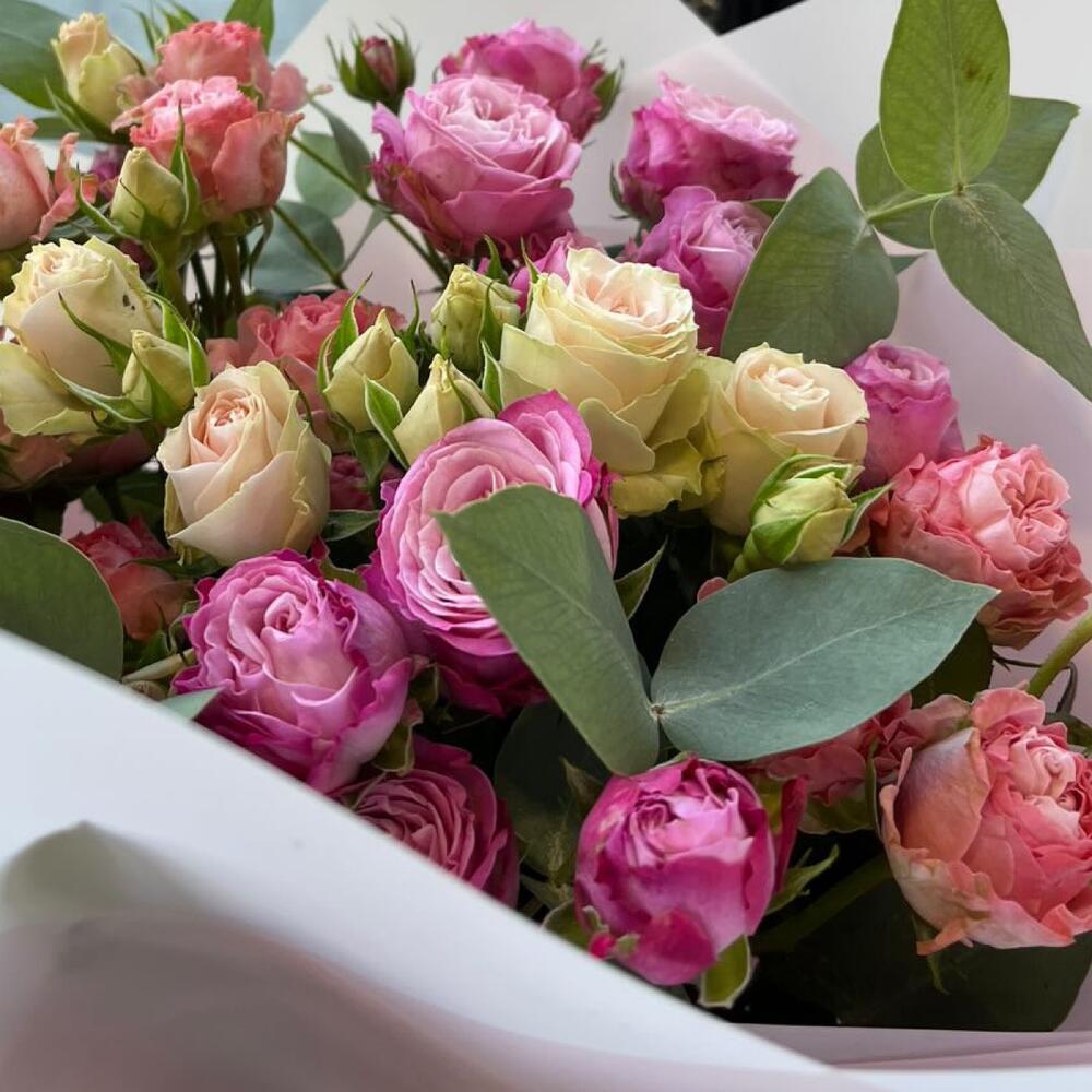 Пионовидная кустовая роза – 13 шт. Упаковка дизайнерская – 2 шт. Открыточка с вашими пожеланиями – 1 шт. инструкция по уходу за цветами – 1 шт.