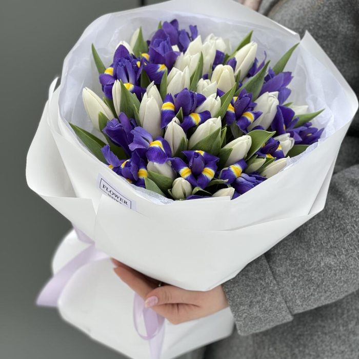 Букет из белых тюльпанов и синих ирисов!